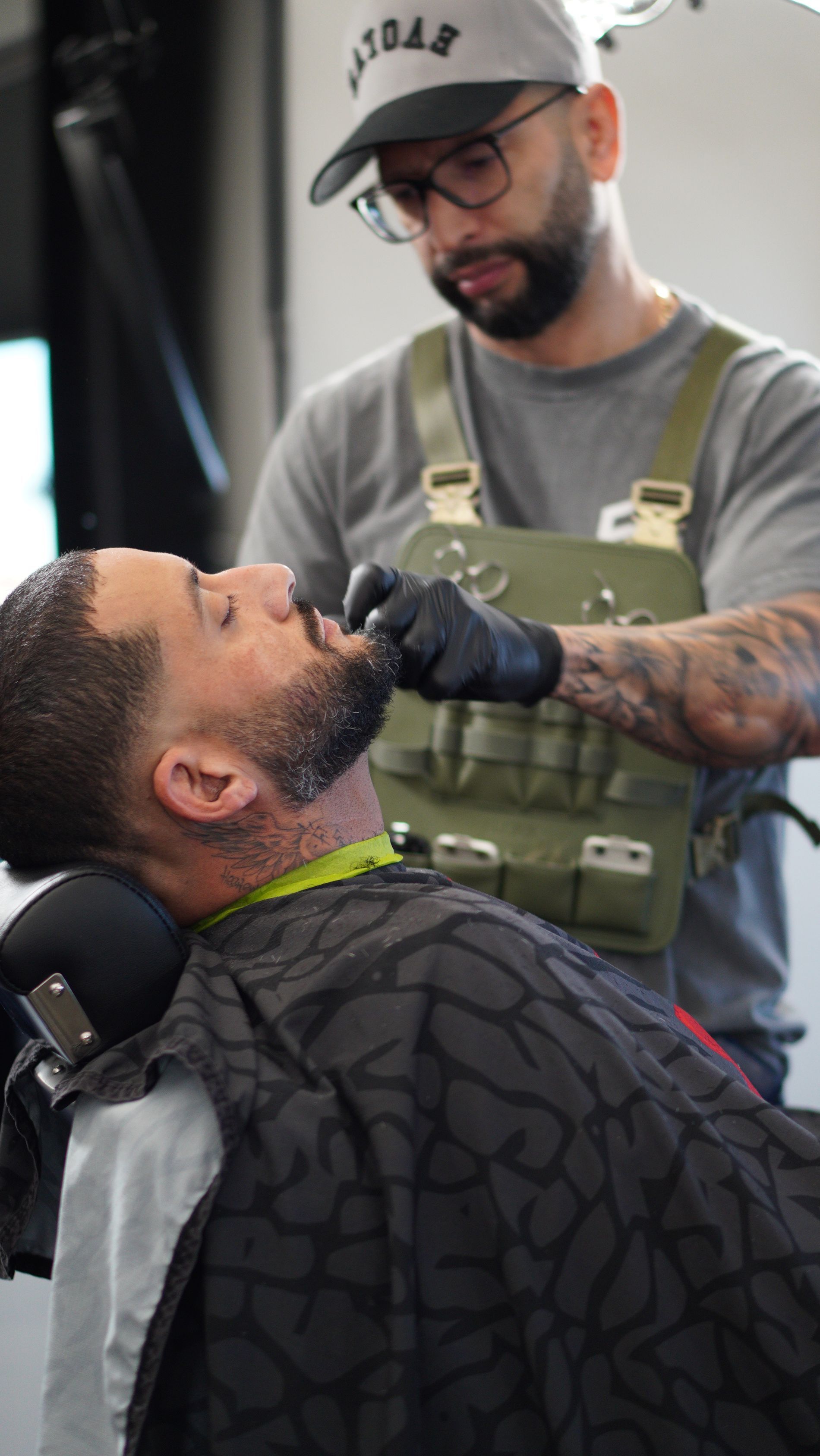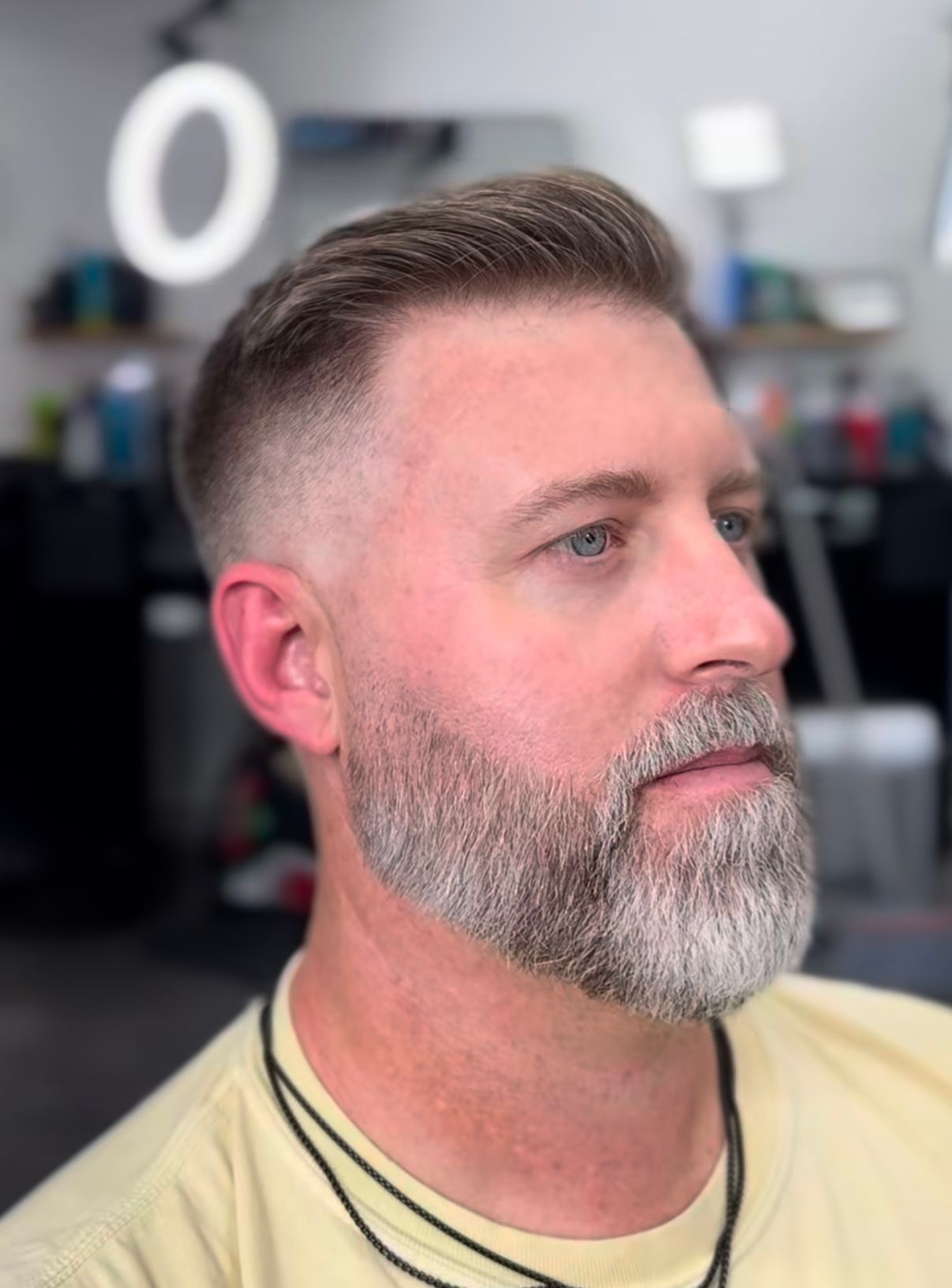 Beard shaping, straight razor face shaves, head shaves, beard color.